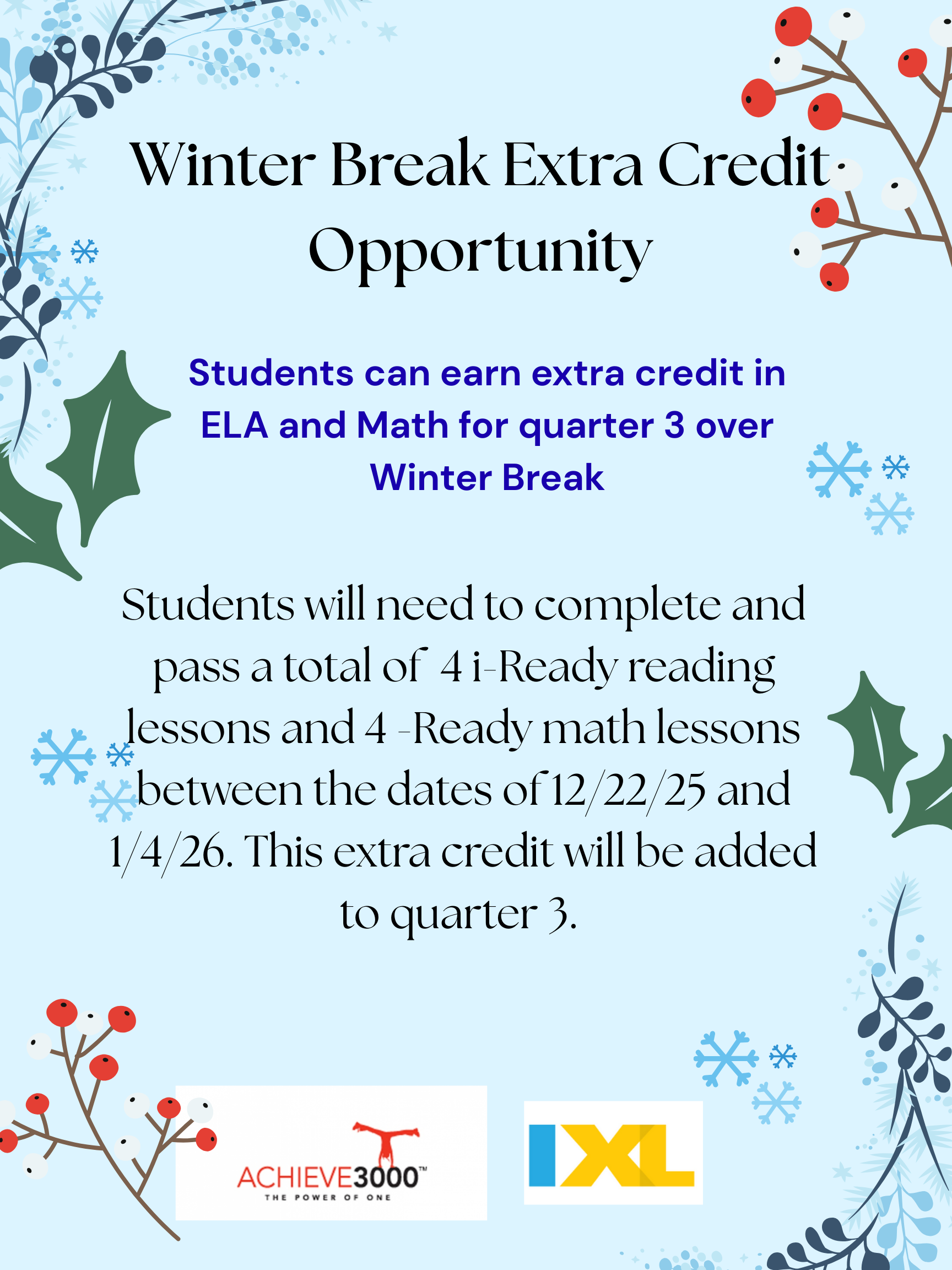 **Elementary students (grades K-5) will need to complete and pass 4 i-ready reading and 4 i-ready math lessons between 12/22/25 and 1/4/26 in order to receive extra credit.